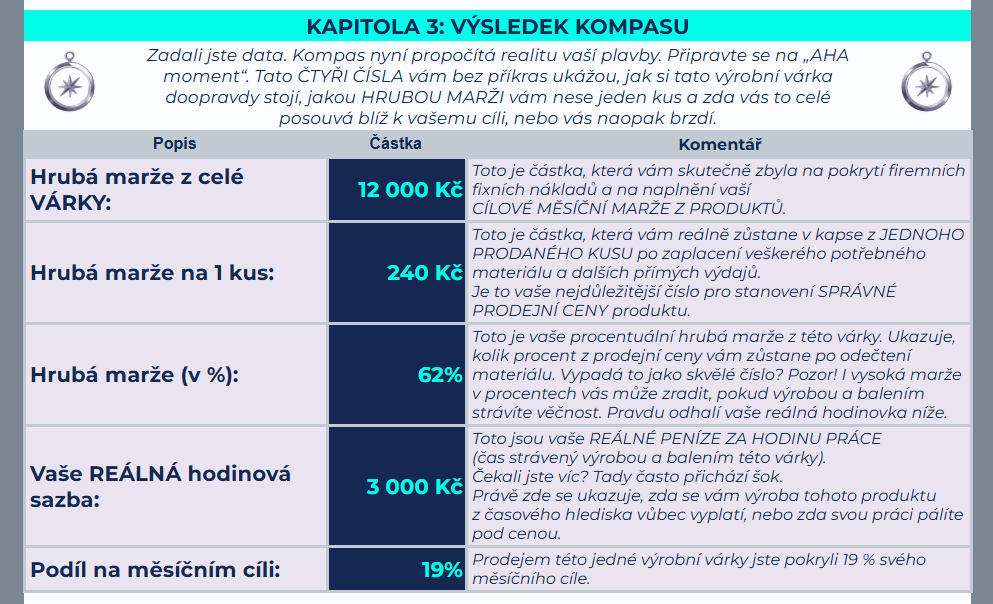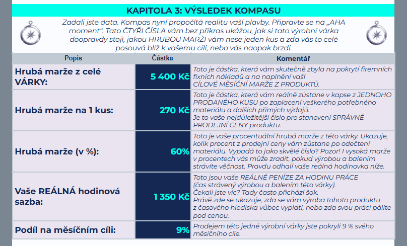 Tuto laťku (900 Kč/hod) Lenka přepsala do Kompasu. Potom jsme začaly zadávat reálná data jejích výrobních várek… a přišel nejeden šok…