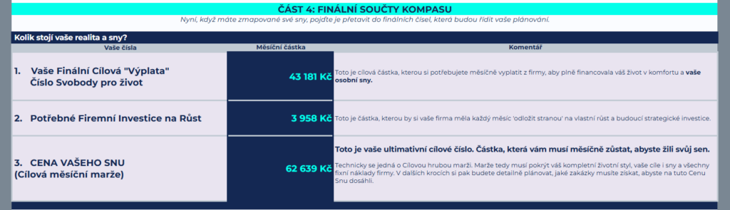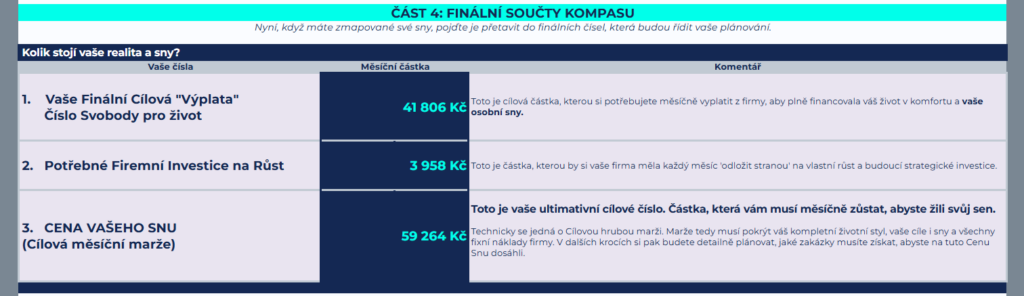 Lenka se v KORMIDLU vrátila k listu MAPA REALITY. Ten neúprosně sčítá nejen firemní fixní náklady (průvan, který musíte platit, i když nic neprodáte), ale i osobní výdaje rodiny.