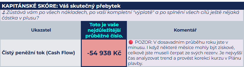 Na konci srpna si Lenka spočítala, že si díky nižším prázdninovým výdajům pošle z firmy na rodinný účet jen své minimum (Osobní nulu 15 788 Kč), aby rodina měla na hlavní výdaje. Otevřela Kormidlo, aby to zapsala, a zatajil se jí dech. Kdyby Lenka sledovala jen své tržby nebo spoléhala na svou krásnou marži z Kompasu, mohla by si gratulovat, jak skvěle se připravila na sezónu. Kormidlo jí ale na Palubní desce nemilosrdně ukázalo Čistý měsíční peněžní tok (cash flow) v hlubokém minusu: -54 938 Kč.