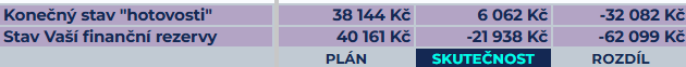 Nejenže svou finanční rezervu úplně vyluxovala a vybrala účty takřka na nulu (zbylo jí posledních 6 062 Kč fyzické hotovosti), ale ona doslova dluží necelých 22 000 Kč sama sobě ve své “výplatě”! Její skvělý časový plán s nákupem zásob ji finančně uvrhl zpět na úplný začátek, kdy rezervy neměla.