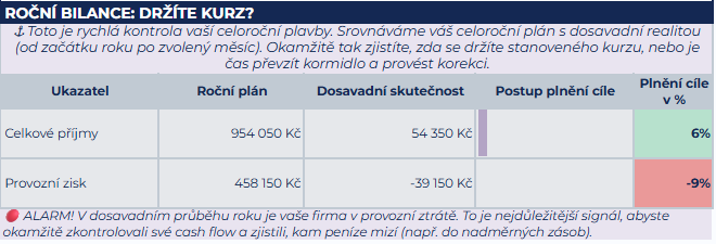 „🔴 ALARM! V dosavadním průběhu roku je vaše firma v provozní ztrátě. To je nejdůležitější signál, abyste okamžitě zkontrolovali své cash flow a zjistili, kam peníze mizí (např. do nadměrných zásob).“