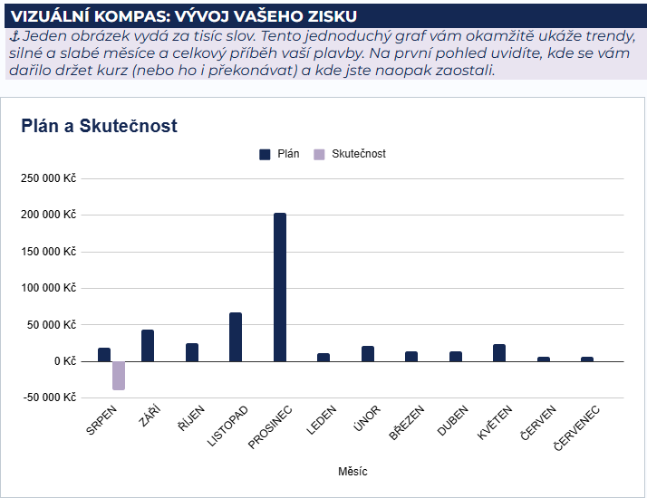 Tady se ale Lenka mohla díky Kormidlu konečně uklidnit a znovu se zhluboka nadechnout. Když se totiž podívala na svůj celoroční výhled v Plánu plavby, jasně viděla, že s takovým výkyvem musí při naskladňování zkrátka počítat. Systém jí ukázal, že tento hrozivý mínus je jen dočasná situace. Jakmile se totiž na podzim a v zimě její zásoby promění v prodané zboží, peněžní tok se postupně uzdraví a na konci roku loď bezpečně dopluje do plánovaného zisku.